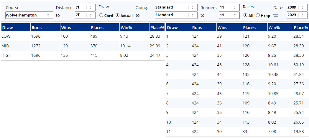 If we look at past 11-runner contests over 7f here at Wolverhampton, our Draw Analyser says...