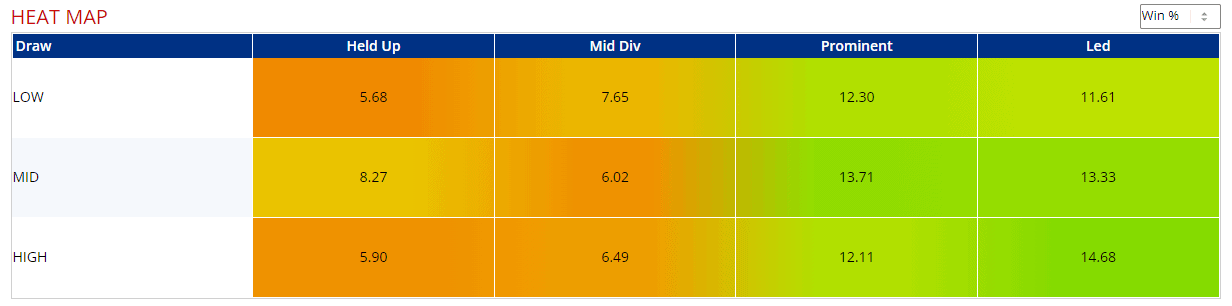 ...that leader/prominent runners are twice as likely to win those further back in the pack and this is further highlighted by the pace/draw heat map...