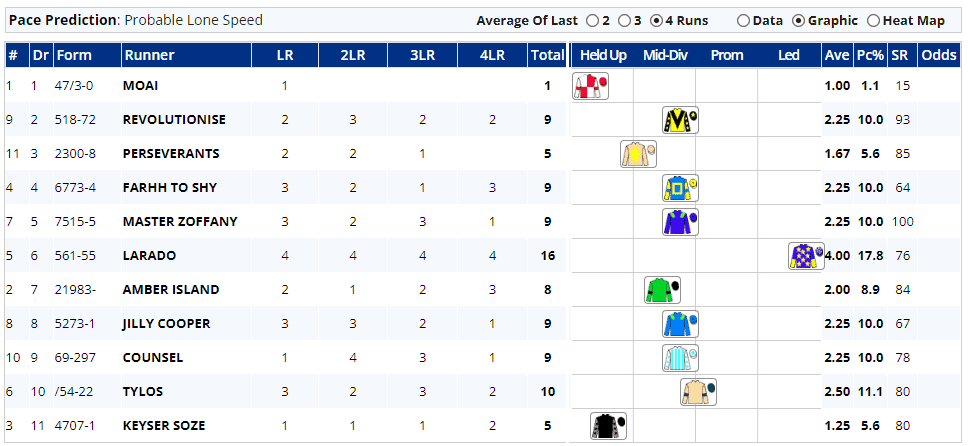 Although stalls 1 to 7 were favoured on the draw stats, the heat map above does tend to imply that pace is more important than draw, so let's now look at who might (based on recent evidence) be the ones racing in the upper half of the field...
