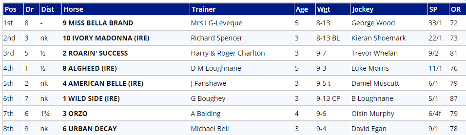 None of this field actually raced at Class 3 last time out, as Wild Side, Roarin' Success, Achillea and Finery step up from Class 4 and the bottom three on the card (Hey Lyla, Lady Mojito & Enola Grey) all raced at Class 5. Yorkshire Lady's Class 2 run a month ago makes her the only class dropper here.