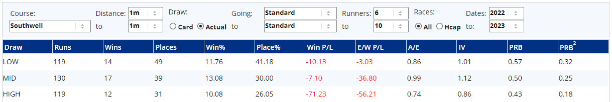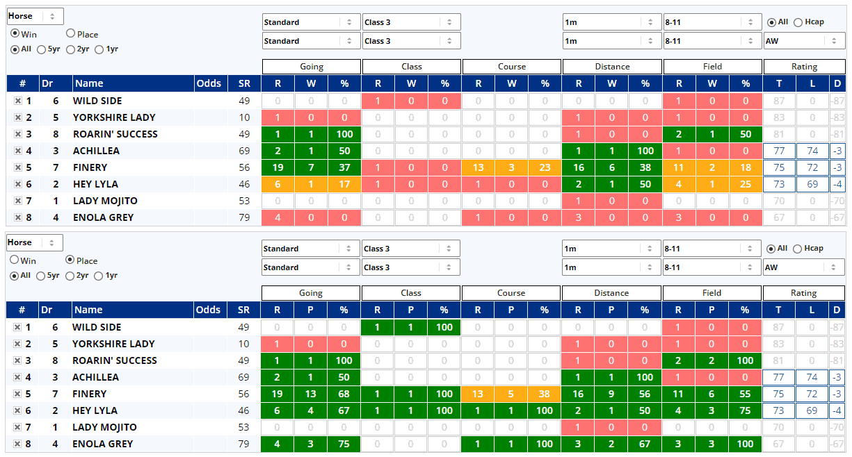 Instant Expert didn't exactly help too much today, but the pace/draw heat map suggests we should look at those drawn highest here, even if that hasn't always been successful at Southwell. Both our Shortlist runners, Wild Side & Roarin' Success are involved and although the latter looks slightly worse off than the former, she did come out best last time and off the same marks, I suspect that Roarin' Success might just hold Wild Side off, although it'll be tight again.