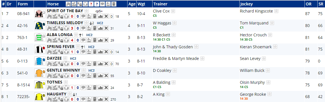 Three of these (Spirit of the Bay, Alba Longa & Spring Fever all won last time out, whilst Haughty is the only maiden in the field, albeit off just five starts. half of the field ran at this Class 4 level last time out, but Timeless Melody drops in from Class 2 and haughty is down one class, whilst Alba Longa and Spring fever both step up one level.