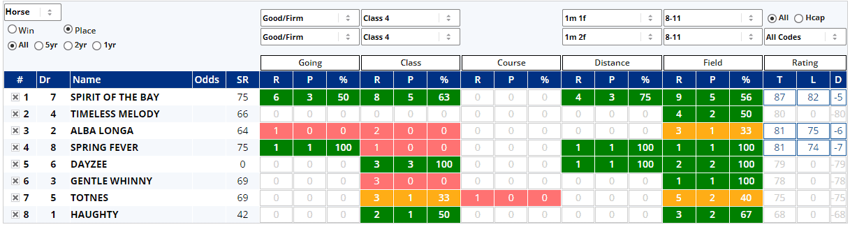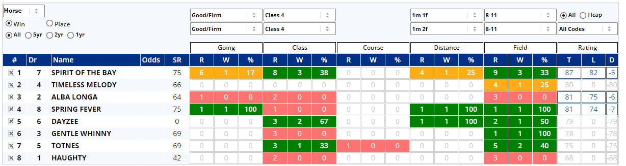 Bottom weight Haughty might need the run as she comes off a nine-month break, but her rivals have all race at least once this term. We''re not getting too much from Instant Expert today, as the field only have 51 previous outings between them and top weight Spirit of the Bay accounts for 21 of those races, but let's see what data we do have...
