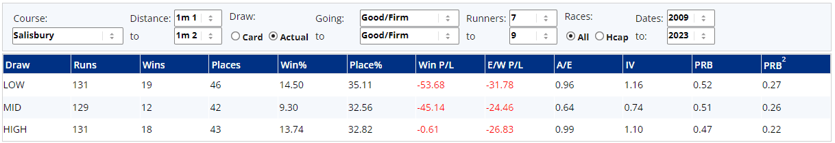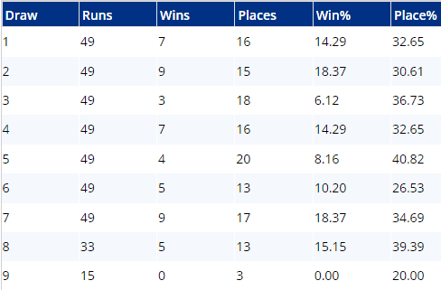 ...all fairly self-explanatory and the one catching my eye is Spirit of the Bay, especially from a place perspective. She's top weight and drawn second widest in stall 7 and whilst the draw stats suggest those drawn lowest would fare best, the raw data actually says there's not really a massive bias at play here...