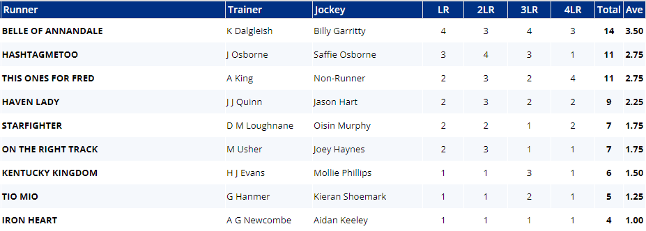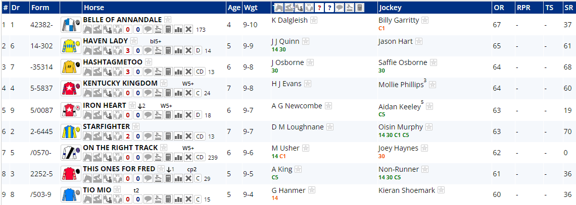 Kentucky Kingdom, This One's For Fred and Tio Mio are former course winners (at 1m1½f, 1m6f & 1m1½f), whilst Haven Lady and Iron Heart have previous wins over a mile and a half. Belle of Annandale has won at neither track nor trip, but Hashtagmetoo, Starfighter and On The Right Track are all course and distance winners.