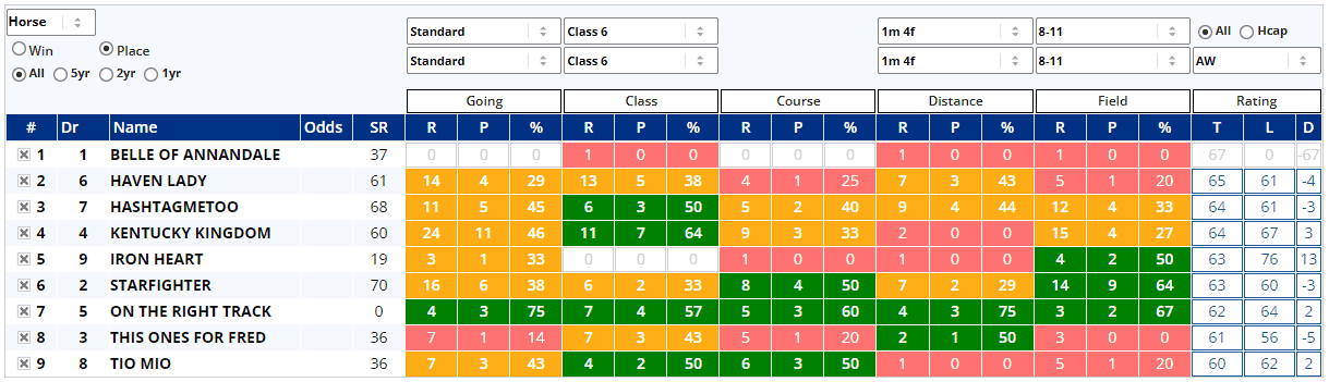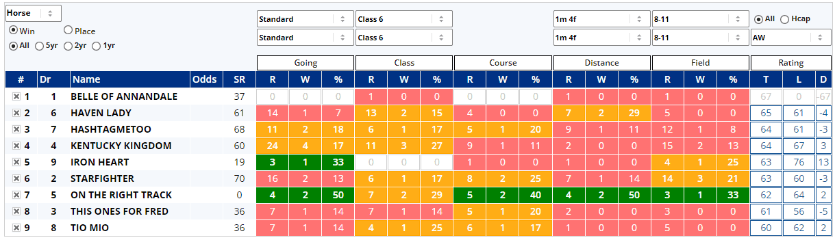 Instant Expert also tells us that all bar Belle of Annandale have won on standard A/W and that all bar Belle of Annandale and Iron Heart have won a Class 6 A/W contest...