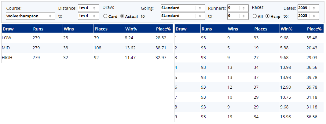 Other than not getting hampered or cut-up on the bends, there shouldn't really be a massive draw bias in a 9-runner contest over a mile and a half, but let's check the actual stats...