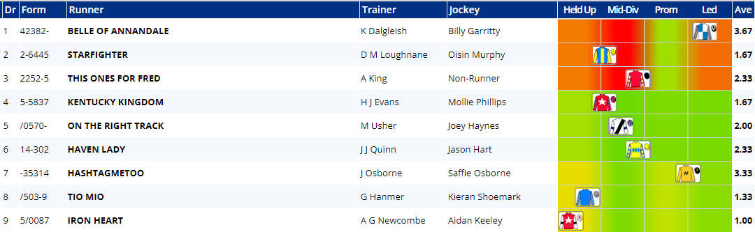 ...wouldn't bode well for the likes of Kentucky Kingdom, Tio Mio or Iron heart and if we use a three-race sample size and arrange the field in draw order using those draw/pace stats abo, we can generate this heatmap...