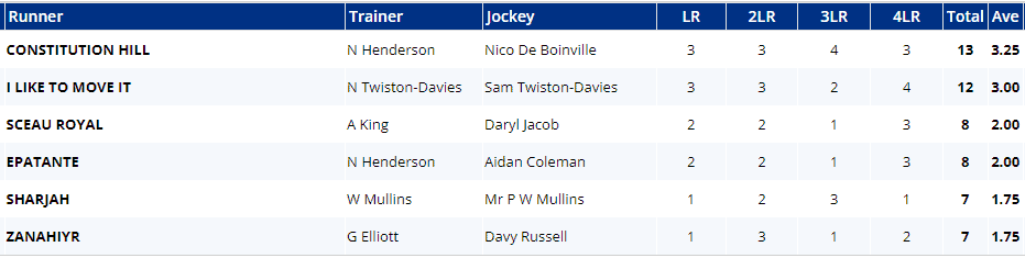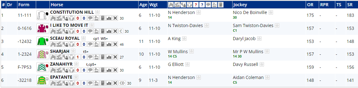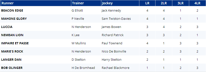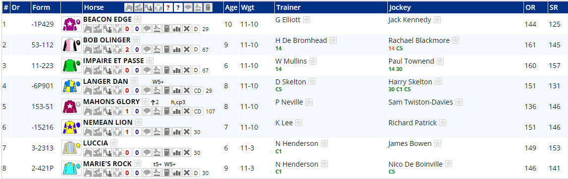 All twelve raced in Class 1 races last time around and most have raced at least once in the last two months, but Champ & Strong Leader haven't been seen for eleven weeks, Hewick's last outing was his win in the King George on Boxing Day, whilst Proschema hasn't re-emerged since being pulled up before three out in this very race last year.