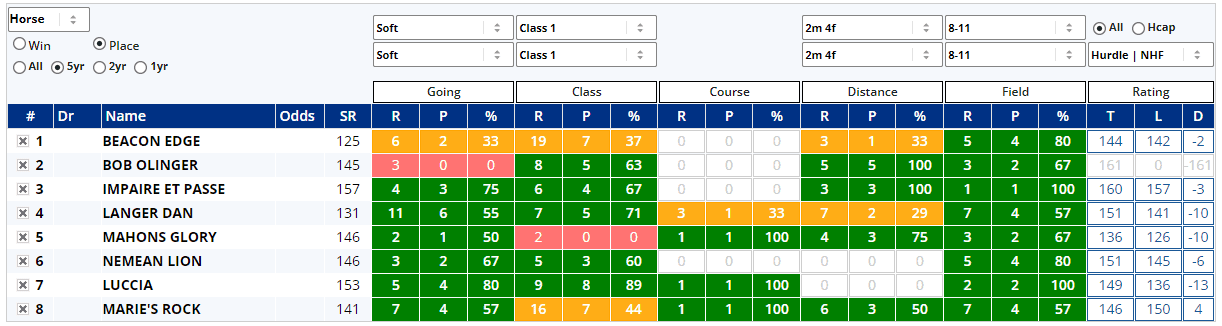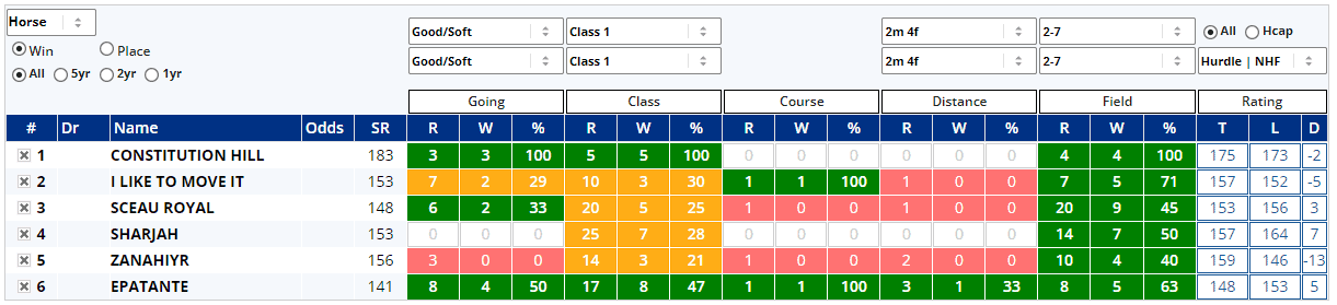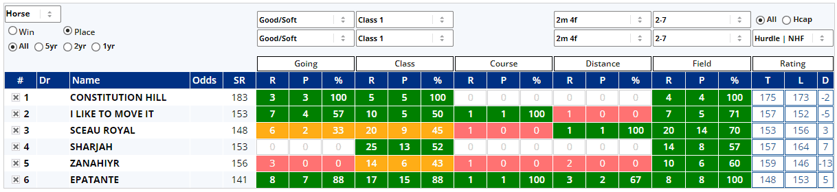 HINT: Look for a good sample size – ideally five or more – combined with a decent win percentage (30%+), and a positive figure in the profit column and as ever, please refer to our User Guide for further information.