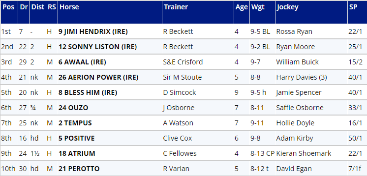 At the Royal Meeting in 2023 there were six straight course handicaps where the field sizes ranged from 26 to 30 runners. The first such contest of the week, the Royal Hunt Cup, produced the following result. The first ten finishers are shown: