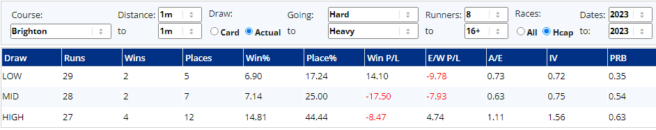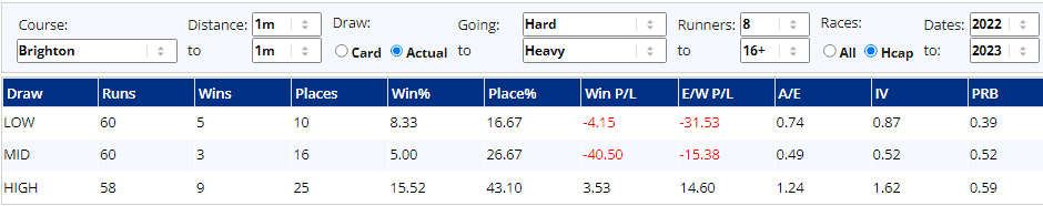 Two years ago, when I wrote a series of articles on the draw, I mentioned the 1-mile Brighton bias in the third article. At the time, I had not previously been aware of this bias. In that piece the draw data from 2016 to 2021 suggested that high draws held an edge with low draws being at a disadvantage. Looking at the 2023 figures for handicaps with 8+ runners we see the following: