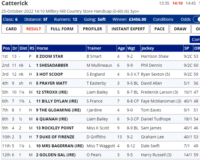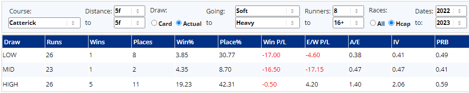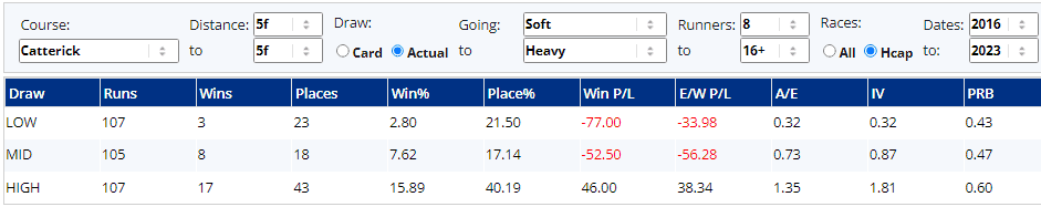 These figures indicate that soft ground bias at Catterick over 5f gives punters a playable bias to work with. Indeed, you could have backed the highest three draws ‘blind’ over these 28 races and secured a profit to SP of £27.00 (ROI +32.1%); to BSP it would have been £43.44 (ROI +51.7%).