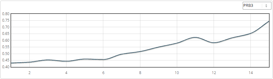 Before moving on, let us look at a smoothed-out graph of stall positions based on PRB figures from soft/heavy 5f handicaps from 2016-2023 using the Geegeez metric PRB3: