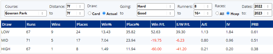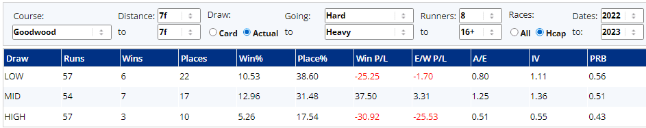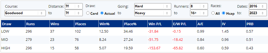 Before moving on here are the basic draw splits for Goodwood 7f handicaps (8+ runners) since 2016: