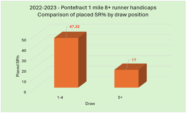 These results clearly show the strength of the bias – just look at the PRB figures and the placed percentages for the lowest draws. If we include stall 4 with the bottom three stalls, we get the following splits in terms of placed percentages: