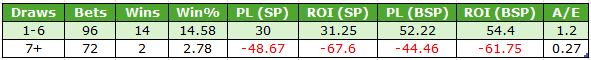 This data seems to demonstrate there has been a strong draw bias at work in the past two seasons. It also demonstrates that as punters it is worth analysing data in different ways to build the most accurate picture we can. This is especially true when we are looking at small to medium sized samples.