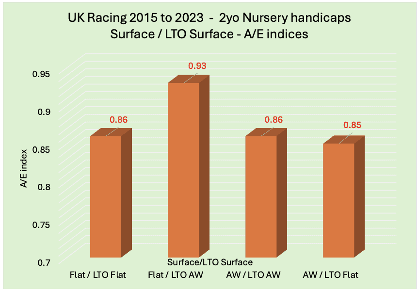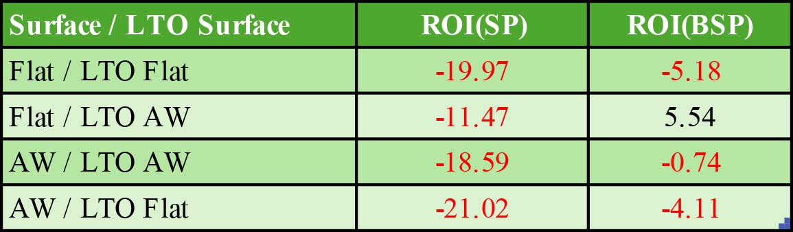 Horses switching from a run on the all-weather LTO to the turf this time have offered punters by far the best value. This is also reflected in the returns for both SP and BSP.