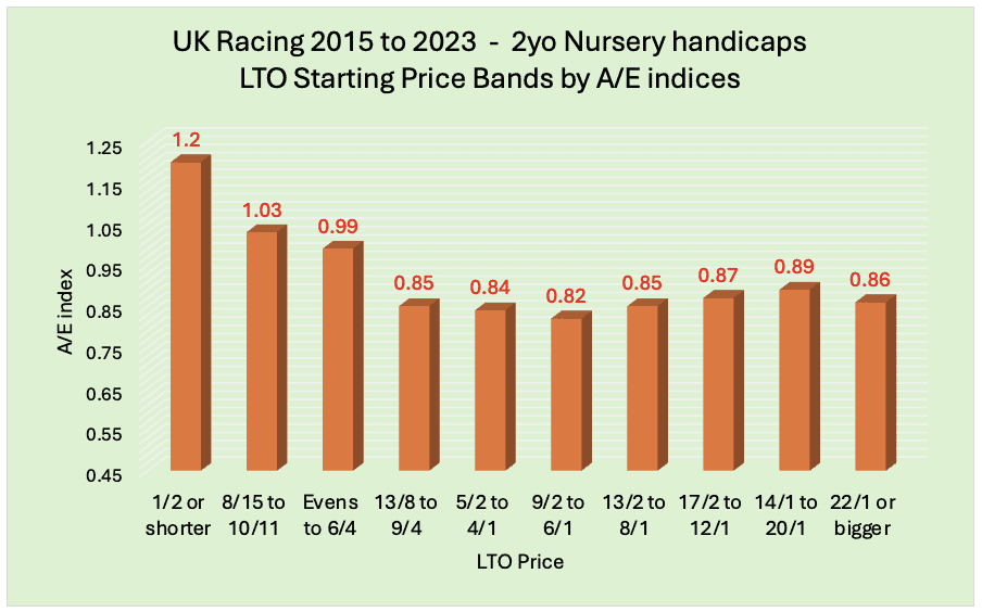I often look at this metric: the price of the horse on its last run. To begin with, I will look at some LTO Starting Price Bands, focusing on the value metric, which is the A/E index: