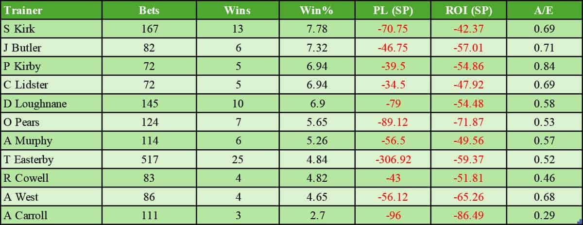 Ten trainers have managed a profit of which eight have an A/E index above 1.00. All eight of these trainers should be classed as positive in these races. I will revisit some of these in a minute, but before then, onto those trainers who have recorded a strike rate of below 8%: