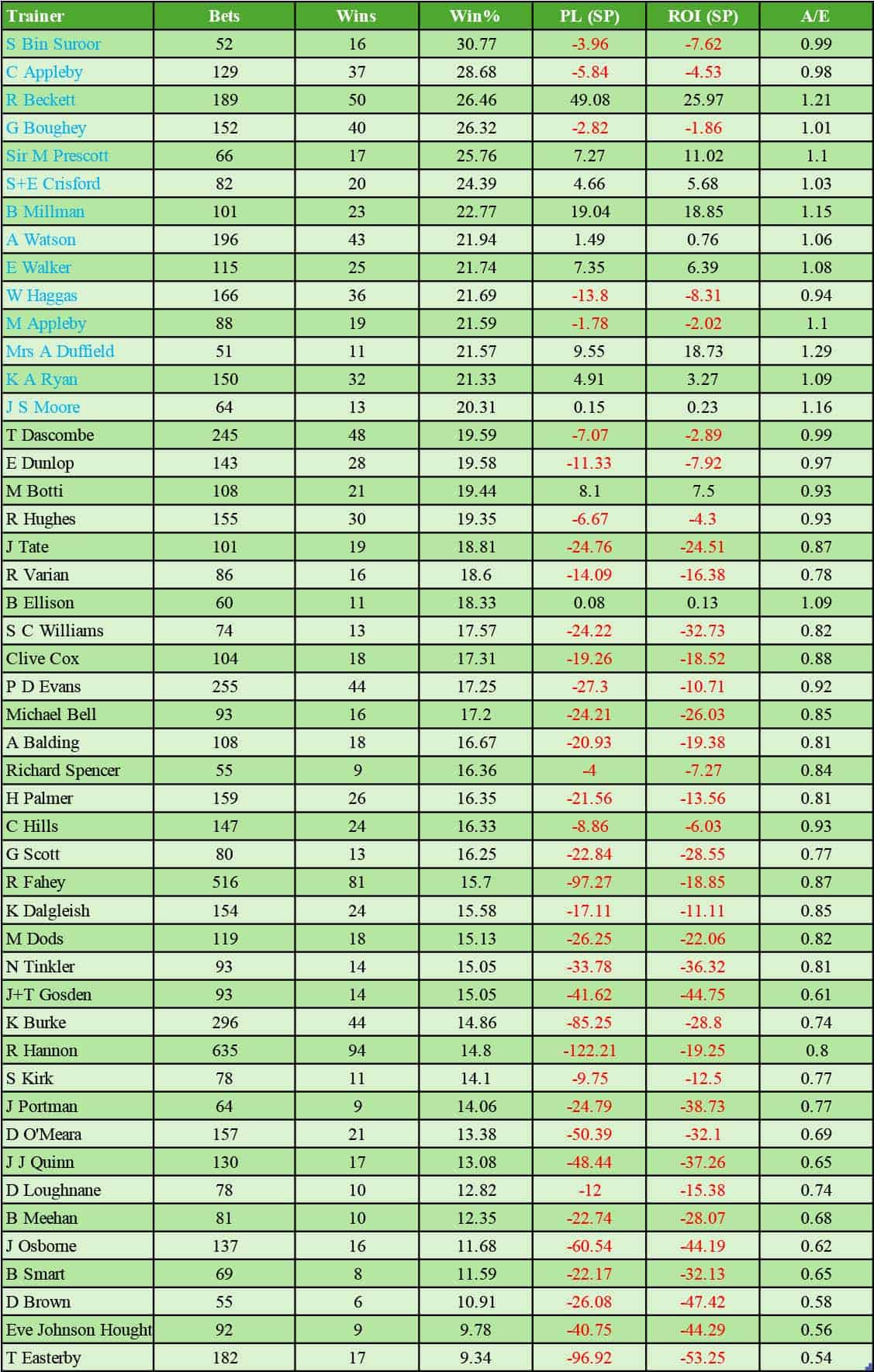 I think any trainer in the bottom quarter of the table whose A/E index is under 0.75 should be treated with caution.