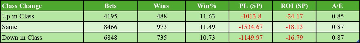 There is not much to choose between the three here, although the ROI% is better for class droppers. Class droppers have been profitable at Betfair SP but these results have been skewed by several high prices hitting the mark.