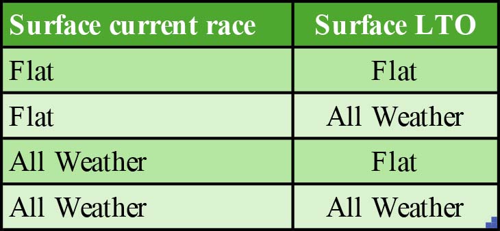 I want to share some data on what surface the nursery was run on (e.g. turf or all weather) compared with the horses' previous start. Hence, there are four possible combos to look at: