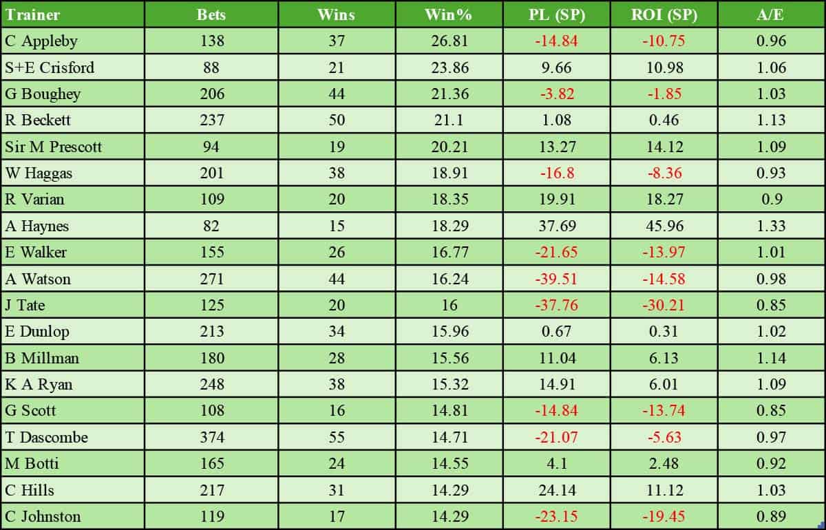 1. Charlie Appleby at Newmarket has secured 14 wins from 37 (SR 37.8%) for an SP profit of £13.29 (ROI +35.9%).