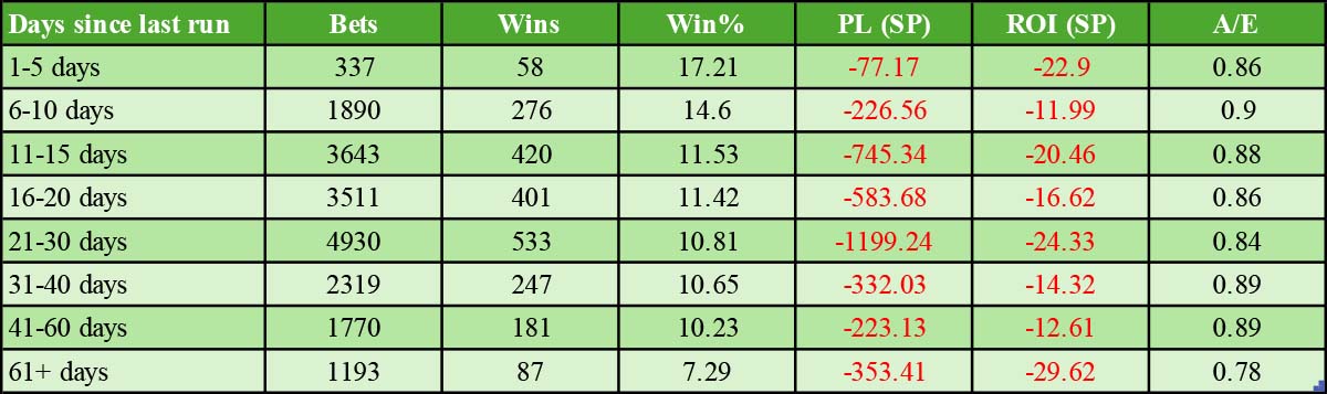 In this second article, I will look at fitness in terms of when their most recent run was, LTO price, and trainers, amongst other things. The data are sourced from the last nine seasons of UK flat and all-weather racing (2015 to 2023), and profits and losses are quoted to Industry SP. I will quote Betfair SP where appropriate.