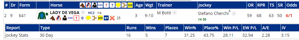 ...which tells us that we've a 5 yr old rated a narrow second on the neural ratings we licence from Dr Peter May and who is trained by one of a number of handlers that I keep an eye out for in Class 4/5 hurdles.
