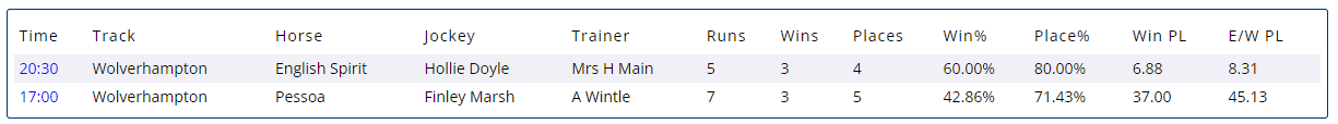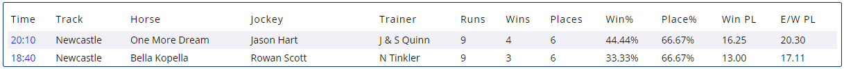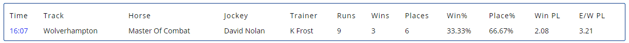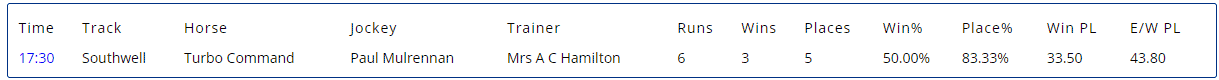 As well as today’s race time, course, horse name, jockey and trainer name, there is a breakdown of runs, wins and places, and profit and loss calculations for both win and each way betting and as with all Geegeez reports, there is a ‘Today’ and a ‘Tomorrow’ (for the next day’s racing) view.