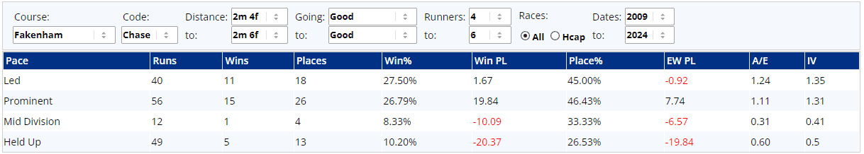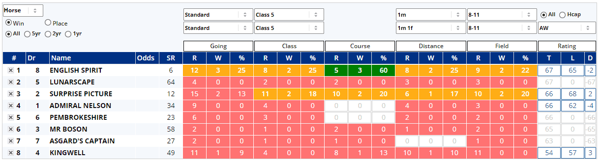 You could at the outset, make a case for most if not all of the field to put up a decent effort here, but if remove Soul Icon, Jet Plane and Half Shot based on Instant Expert data and Heltenham based on his pace profile, I'm down to six runners, which still isn't ideal. Take All is 0 from 6 on soft ground and has only made the frame twice, so I'd say he leaves here, leaving me with half of the the 10-runner field under consideration.