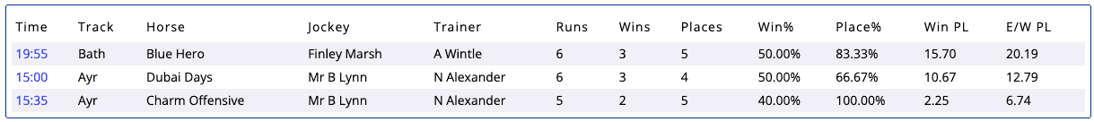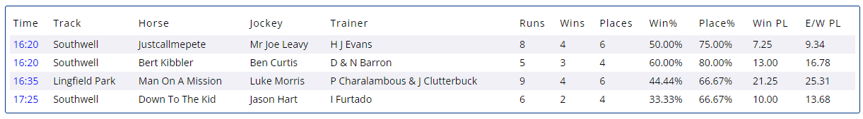 As well as today’s race time, course, horse name, jockey and trainer name, there is a breakdown of runs, wins and places, and profit and loss calculations for both win and each way betting and as with all Geegeez reports, there is a ‘Today’ and a ‘Tomorrow’ (for the next day’s racing) view.