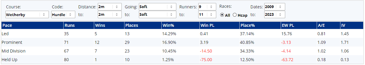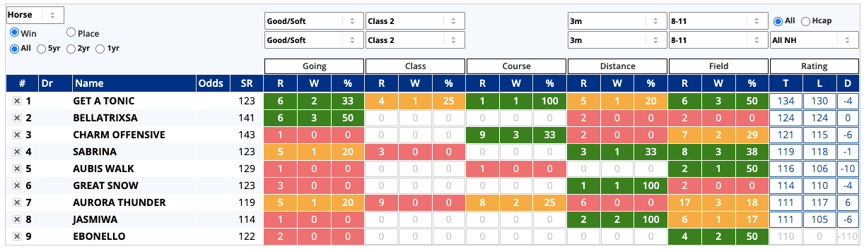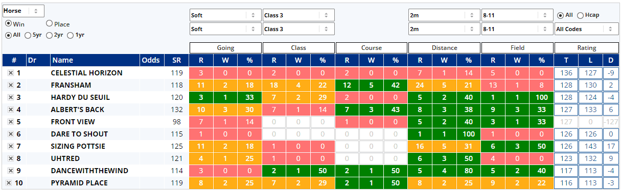 All the above data comes from your racecard above, but clicking the Instant Expert tab will also reveal four previous NH winners on good to soft ground and just the one previous Class 2 success...