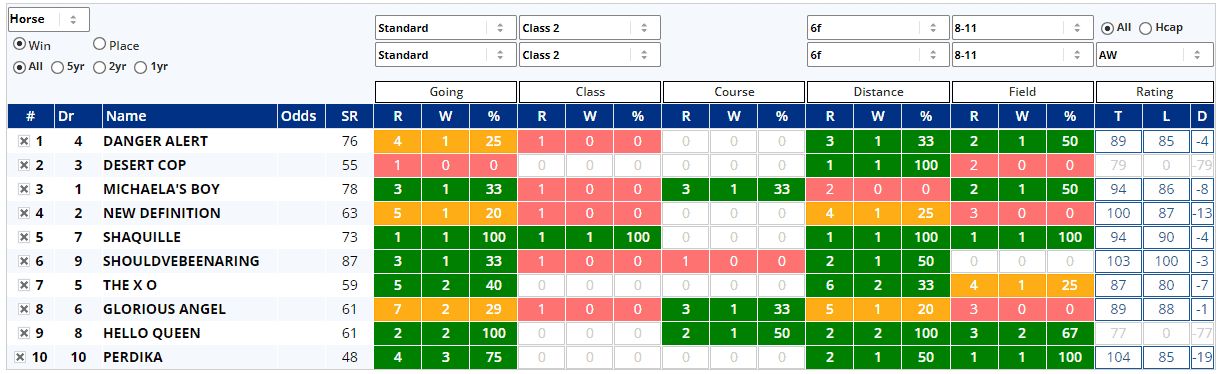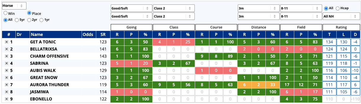 Get A Tonic is that sole Class 2 winner, courtesy of winning this race last year, but she has failed to place in the three defeats at this level. Sabrina has made the frame in two of three Class 2 runs and Aurora Thunder managed to place in five of her nine efforts, but a 0 from 9 win record is worrying, as is her 0 from 6 at the trip. If we looked a little closer at place form...