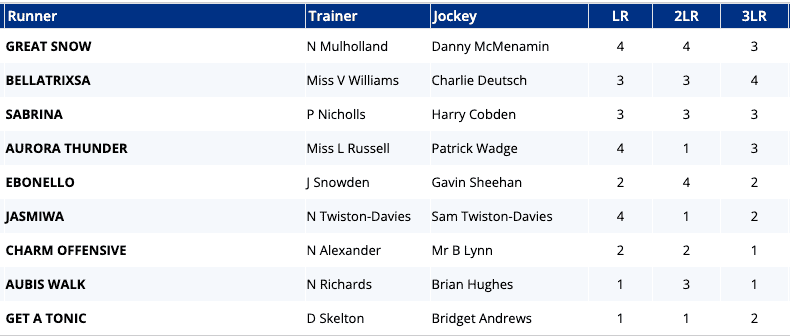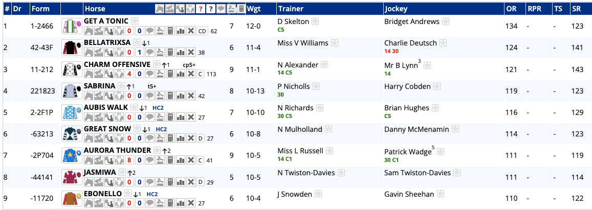 Bellatrixsa and Aurora Thunder are winless in five and eight NH races respectively and whilst the former drops in class here, it'll be tough for the latter stepping up from Class 4. Sabrina has made the frame in seven of her last eight outings, but also steps up in class here. Charm Offensive might well need a run here, after a 113-day absence but aside from last year's winner Get A Tonic coming back from two months off, the rest of this field have all raced since the start of March.