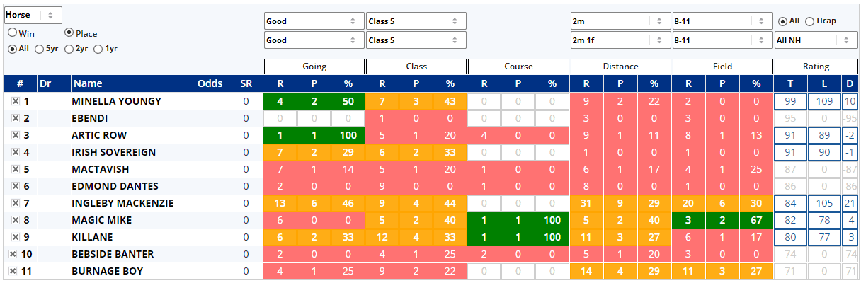 One last note about Kiss My Face is that he's trained by Brian Ellison and will be ridden by Ben Robinson and this trainer/jockey combo have won this race for the last two years and Instant Expert suggests this runner should enjoy the prevalent conditions here...