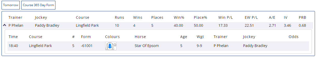As well as today’s race time, course, horse name, jockey and trainer name, there is a breakdown of runs, wins and places, and profit and loss calculations for both win and each way betting. And as with all Geegeez reports, there is a ‘Today’ and a ‘Tomorrow’ (for the next day’s racing) view.