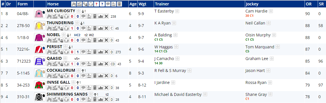 Despite being three from five here at Newcastle, Spirit of Ash hasn't won over course and distance (she hasn't gone beyond 1m5f), but both Bobby Shaftoe and the returning Kiss My Face have scored over track and trip, whilst Red Force One, Sophar Sogood, Artisan Dancer and Yasmin from York have won elsewhere over similar distances to this one.