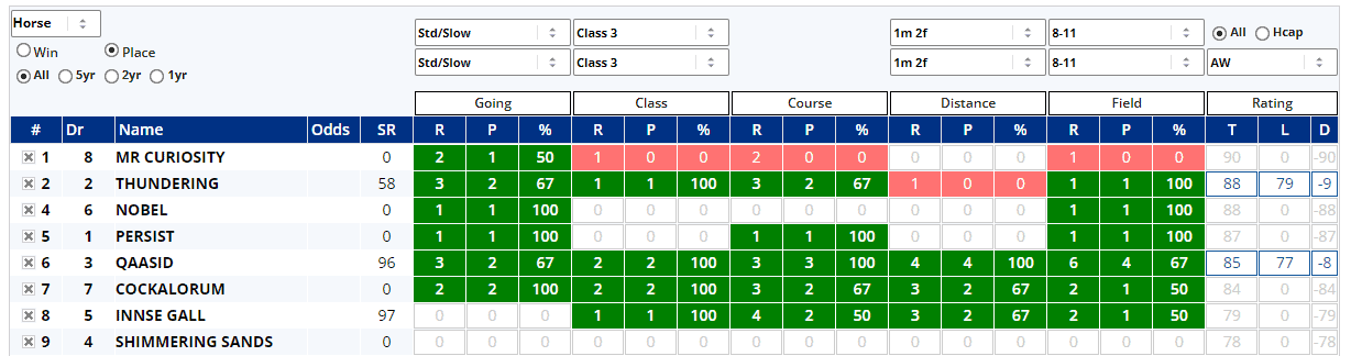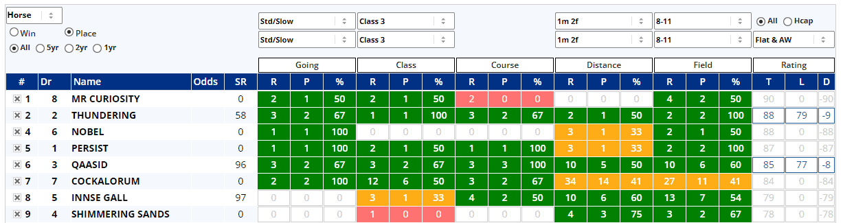 Bobby Shaftoe also has a decent set of figures to back up his claims, but aside from Sophar Sogood, the field look pretty shy of Class 5 A/W wins and this is repeated in the place stats...