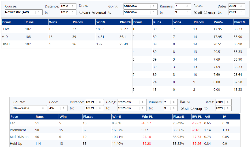 ...but that looks to be an anomaly and I'm fairly sure that the draw won't make or break the chances of a horse that has to run over 3500 yards after the gates open, so I wouldn't necessarily be ruling Bobby Shaftoe out right now, but I'd want him to race as prominently as he could from that lowest draw, if these pace stats are anything to go by...