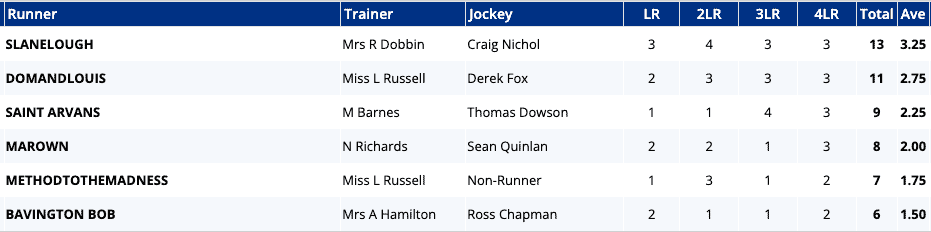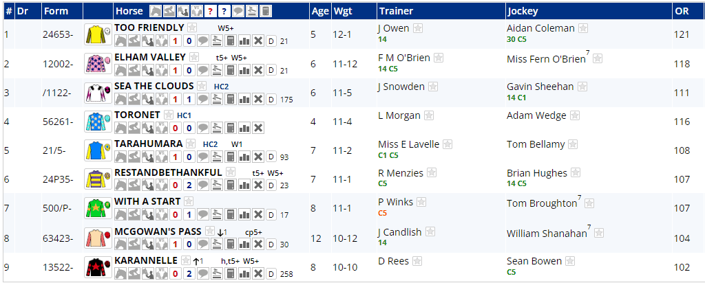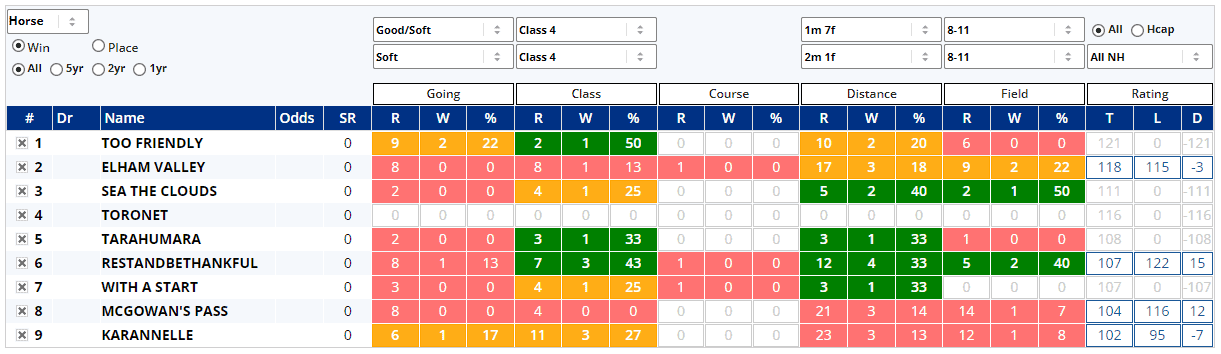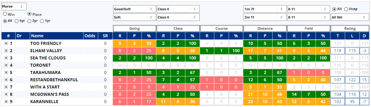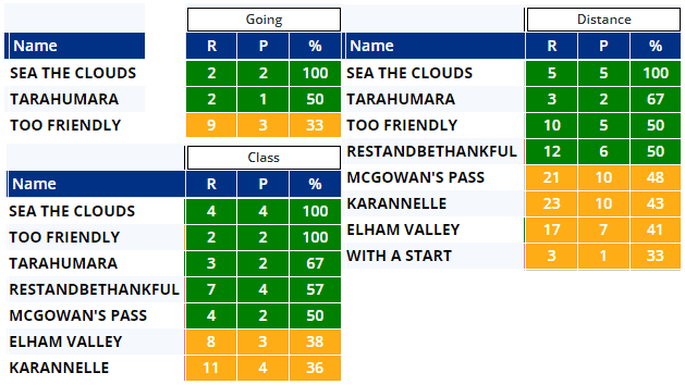 Charging Thunder runs on good to soft for the first time and although his stats look good above, most of that form is on good to firm ground and his recent runs have been hit and miss, finishing 2nd, 10th, 2nd and 13th, all at Class 2 after back to back Class 3 wins (inc 1 x CD) last July. The field's record at this grade isn't good at all aside from Charging Thunder, of course and both Ravenscraig Castle & Alpine Stroll have struggled to win on this softer ground, although they have both made the frame a couple of times...