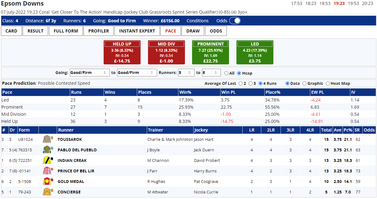 The latest run (LR) shows the run style in the most recent race, 2LR in the second most recent race, and so on. The last four runs are totalled for members (Total), and an average figure (Ave) is calculated also. In this race the most likely early leaders according to totals/averages were Toussarok and Pablo Del Pueblo. As it turned out, the opening furlong saw Pablo Del Pueblo lead with Toussarok racing in second place. Concierge, who had by far the lowest run style/pace total, conformed to past run style data also by racing at the back early.