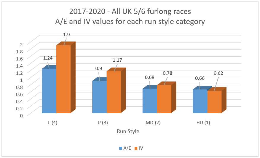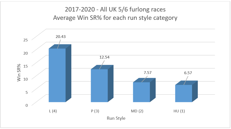 It's time to give you some stats: as you probably know, we tend to call five- and six-furlong races ‘sprints’ due to the fact they are the shortest two distances in flat racing. Looking at all 5f and 6f races in the UK from 2017 to 2020 gives us the following run style strike rates: