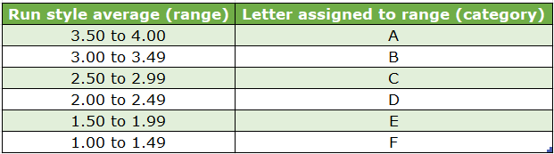 The number in brackets is the run style score that is assigned to each category. These numbers are extremely useful and I will again be using them later to create what I call ‘horse run style averages’.