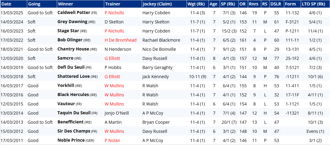 Bob Olinger was 8/1 when causing that surprise (to me, at least) a year ago. In winning at age 10 he was the second 'old man' to take the prize in three years - after Sire du Berlais in 2023 - but the one before was Crimson Embers 40 years ago, and before that Zarane in 1927. Time will catch up with Bob O at some point, probably by now, but it's worth noting that he's four from four at Cheltenham, including in the Baring Bingham (Turners now) hurdle and the Golden Miller (Turners then!) chase, albeit beaten and benefiting from Galopin Des Champ's last fence fall that day.