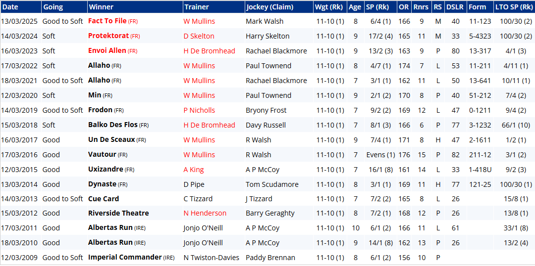 For a Cheltenham festival race, I would not class this as a strong one for past trends. However, here are the strongest considerations:- 9 of the last 18 winners have come from the top three in the betting