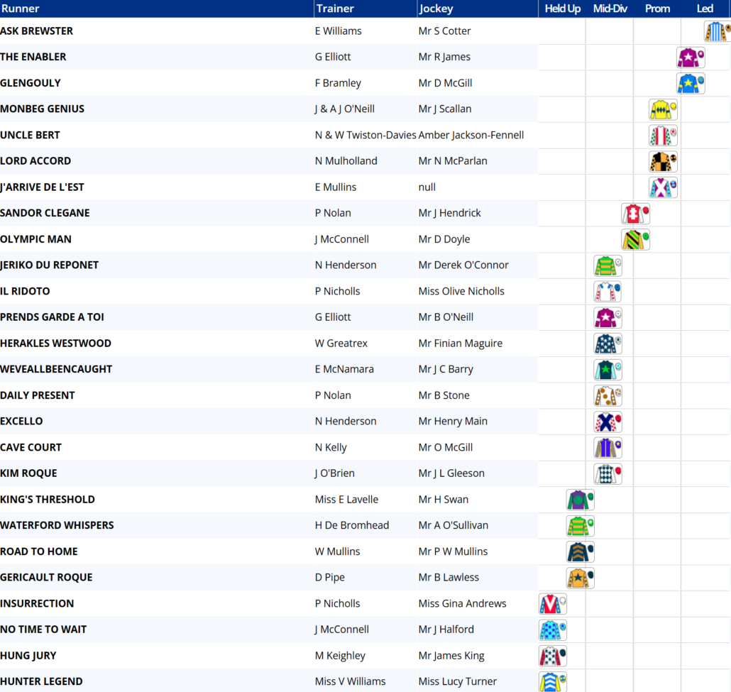 Waterford Whispers - Another JP owned horse, this time trained in Ireland by Henry De Bromhead. Ran an eye-catching race last time at Leopardstown when third and that was his best effort over fences to date.