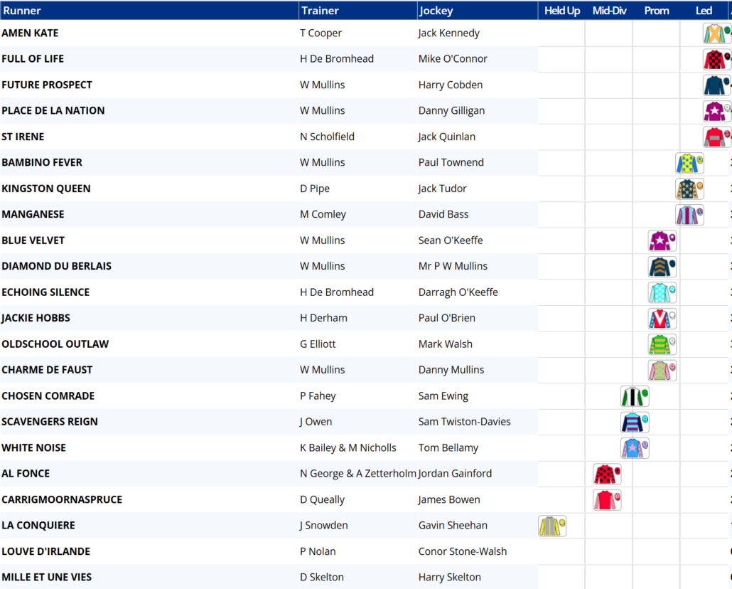 Just a note on her Timeform rating for this race - until modifying her final rating after declarations, Timeform’s assessment of her hurdles form, which consists of a defeat at the hands of Oldschool Outlaw and a maiden hurdle win from a bunch of modest mares who have failed to win any race subsequently, is to award her an adjusted rating of 156p. Her published rating prior to decs was a whopping 19lb lower and that is a more accurate reflection of her hurdle form. I’m not a fan of inventing ratings based on what you expect to happen and it’s a bugbear of mine that Timeform occasionally do it when their methodology is tried and trusted. She deserves one of their big “P” symbols, but not the inflated rating on the racecard.