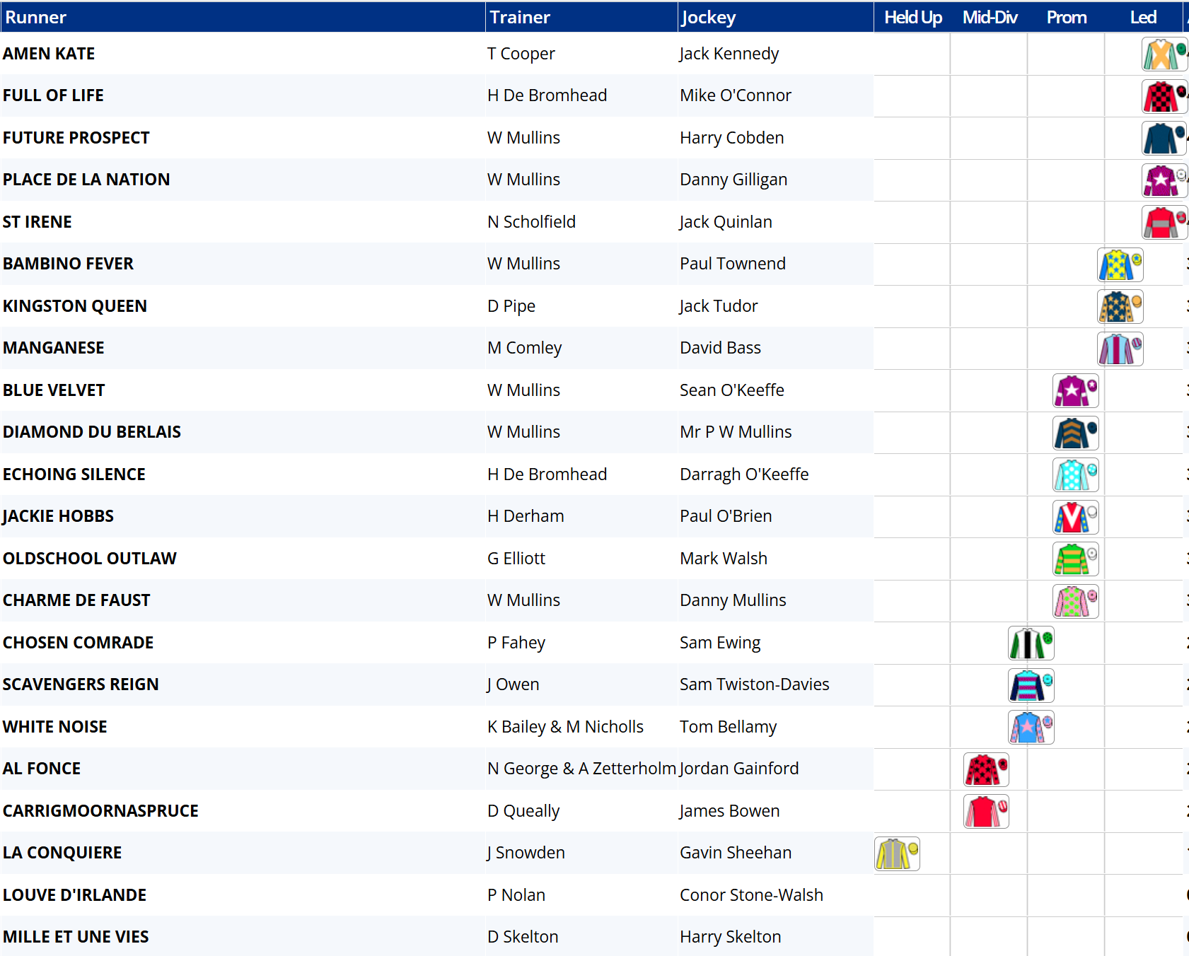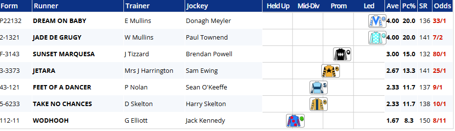 To conclude, Jeriko Du Reponet could just have too much class, but at around 4-1 the price looks far too tight, despite the positive past record of horses near the head of the betting. Waterford Whispers is also 4-1, but in a 26 runner race I can’t convince myself this is value either. I prefer to have three against the field in such a big field.